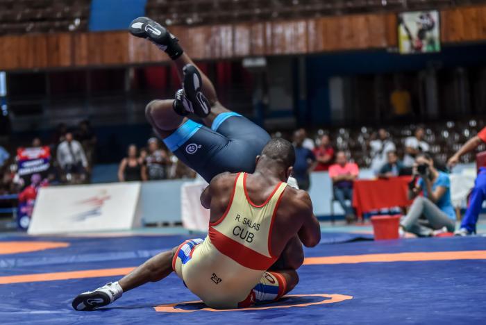 52 Torneo Internacional Cerro Pelado-Granma de Lucha Libre, Final 97 Kg, de rojo Salas R. (Cuba) y de azul Gadson K. (USA), en la Ciudad Deportiva