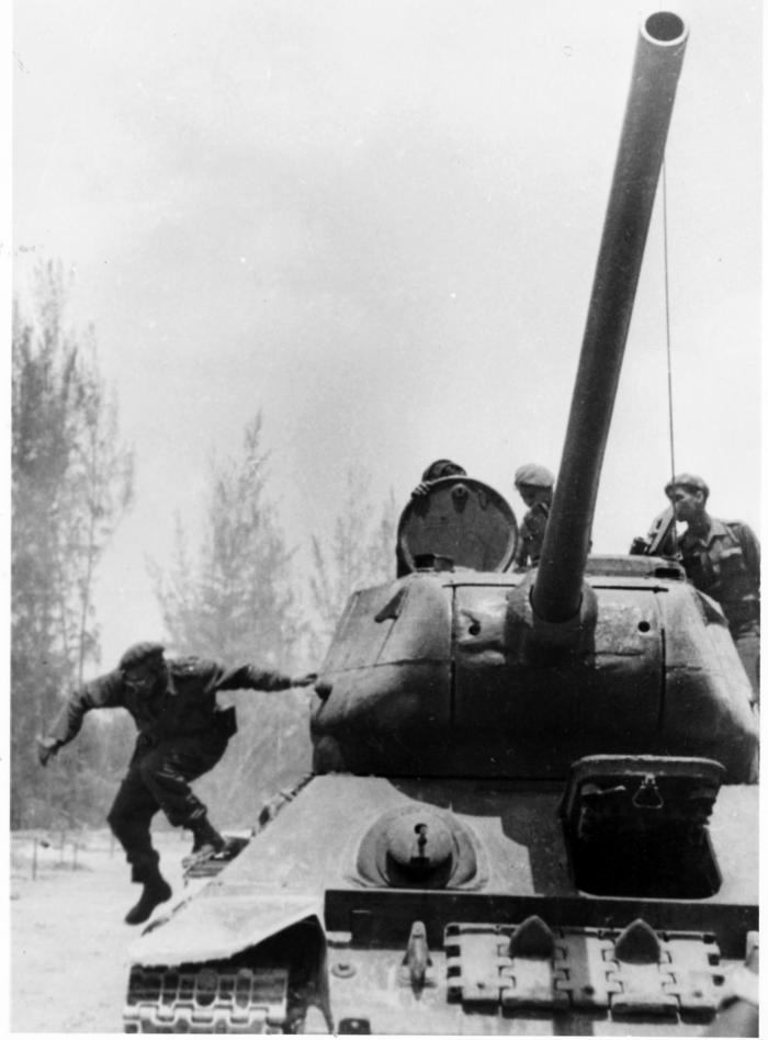 Fidel descendiendo del tanque T-34 en Playa Giron.