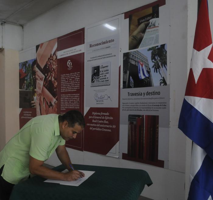 Acto de entrega de diplomas por años de servicios en el Partido y carné de militante de nuevo ingreso, así como " Mi firma por la Patria", en el periódico Granma, presidido por Enrique Villuendas, funcionario del Departamento Ideológico del CCPCC, Yoerkis Sánchez, miembro del CCPCC y del Consejo de Estado; director del diario; así como otros subdirectores y dirigentes partidista.