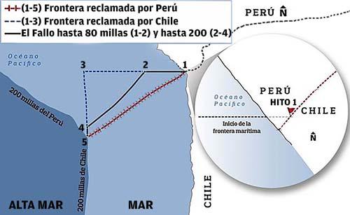 La Haya ratificó las fronteras reclamadas por Chile hasta las 80 millas y más allá de ese punto, dio la razón a Perú hasta las 200 millas. / Mapa: