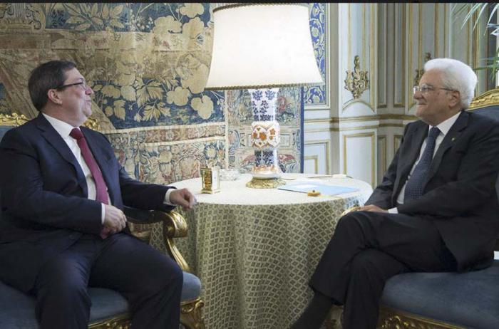 El canciller cubano Bruno Rodríguez Parrilla se reunió con el mandatario italiano Sergio Mattarella (derecha). Foto: Cubaminrex