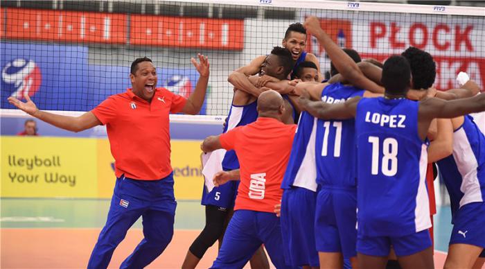 Los cubanos celebran jubilosos su pase a la discusión del oro en el Campeonato Mundial Sub-21 de voleibol .