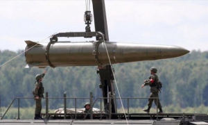 Militares rusos equipan un misil táctico de corto alcance modelo Iskander en Kubinka, a las afueras de Moscú (la capital).