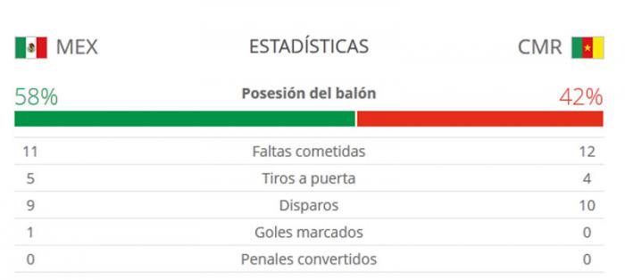 Tarjetas: 50’ Héctor Moreno (MEX); 80’ Nounkeu (CMR)