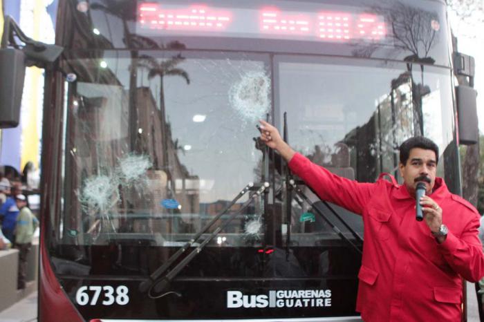 El mandatario mostró varias unidades de Metrobús, valoradas en 600 mil bolívares, que fueron destruidas por grupos de choque de la ultraderecha, por lo que anunció que un total de 50 unidades de Metrobús serán sustituidas para la continuación del servicio.