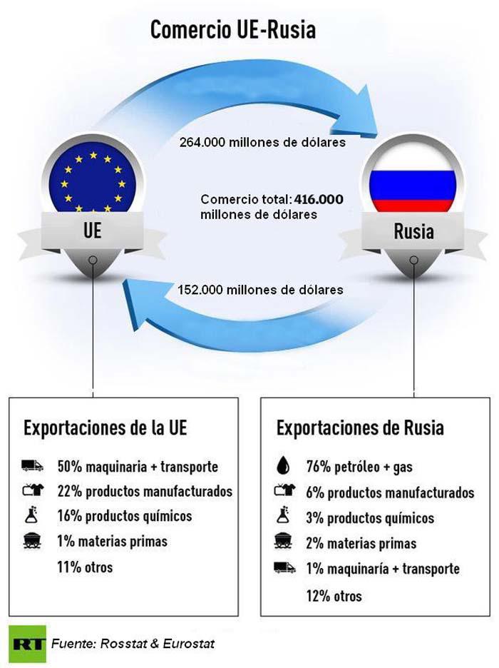 En cuanto al gas, el 40% de las importaciones que realiza Europa provienen de Rusia. En caso de introducirse sanciones contra Moscú, entre el 25% y el 30% de las plantas eléctricas de la Unión Europea podrían experimentar dificultades o detener su funcionamiento, y la población sufriría problemas de calefacción durante el invierno, mientras que tanto el transporte público, el comercial y el privado se verían afectados por la falta de gasolina y electricidad. (Redacción Internacional)