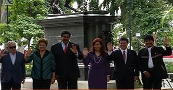 Luego de colocar una ofrenda floral frente a la estatua ecuestre de Bolívar, los presidentes de Argentina, Cristina Fernández; Brasil, Dilma Rousseff; Uruguay, José Mujica; Paraguay, Horacio Cartes; Venezuela, Nicolás Maduro; y de Bolivia, Evo Morales en calidad de asociado, recorrieron el histórico sitio.