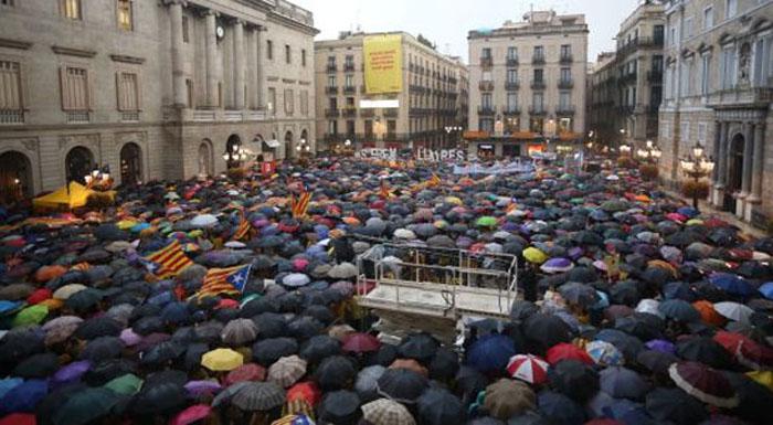 El fuerte aguacero que cayó toda la tarde sobre Barcelona, según el reporte de AFP, no fue obstáculo para que miles de personas vestidas de amarillo abarrotaran la histórica plaza Sant Jaume, donde se encuentran el gobierno regional y el ayuntamiento, y las calles colindantes a gritos de "independencia" y "votaremos".
