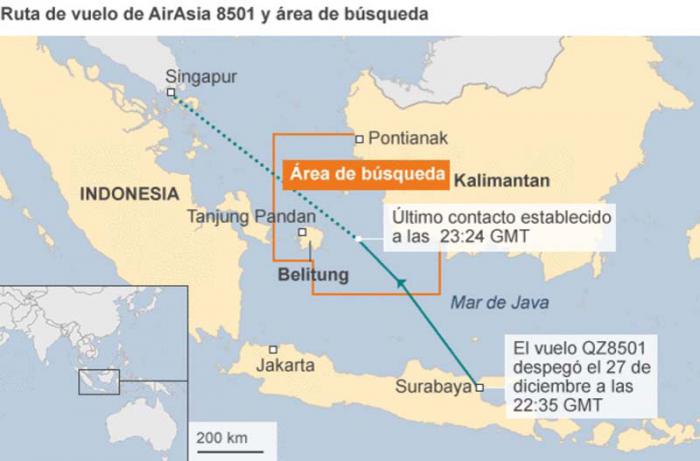 El vuelo QZ8501 de AirAsia despegó el domingo del Aeropuerto Internacional Juanda en Surabaya, en el occidente de Indonesia, a las 22:35 GMT hora local.