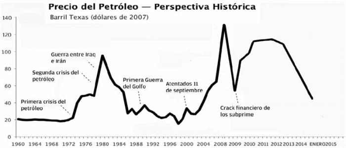 Tras varios años bordeando los cien dólares por barril, su valor en los mercados internacionales registra una caída en picada desde hace varios meses. Esta semana se cotizaba por debajo de la barrera  sicológica de los 50 dólares, una cifra que no se veía desde los meses posteriores al crack financiero del 2008.