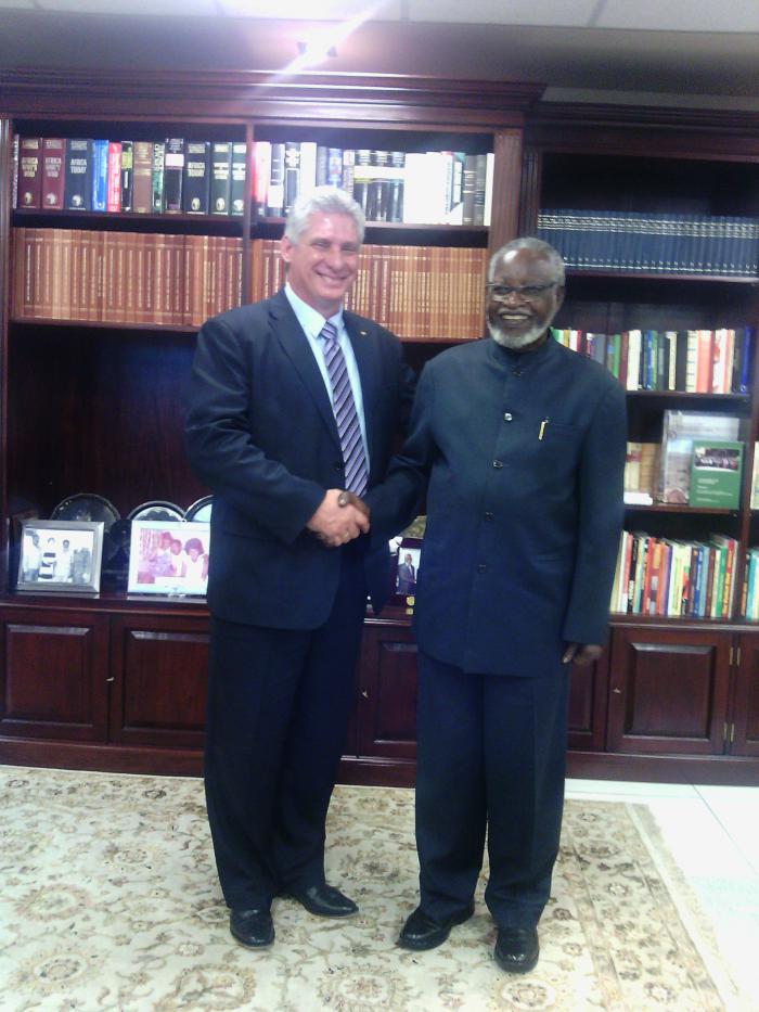 Díaz-Canel le transmitió a nombre de Fidel Castro y el presidente cubano, Raúl Castro, la felicitación por el aniversario 25 de la independencia que se cumple mañana, “para usted como líder indiscutible de esa epopeya independentista y como líder histórico de la SWAPO”.