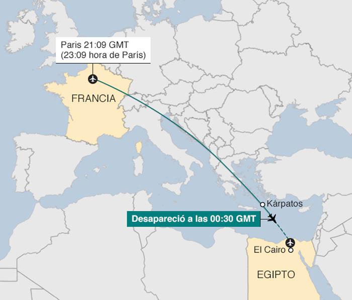 La nave, fabricada en 2003, perdió comunicación con el sistema de monitoreo a las 02:30 hora local de El Cairo (00:30 GMT), cuando se encontraba sobre el mar Mediterráneo, a unos 280 kilómetros de la costa de Egipto y poco después de haber salido de espacio aéreo griego.