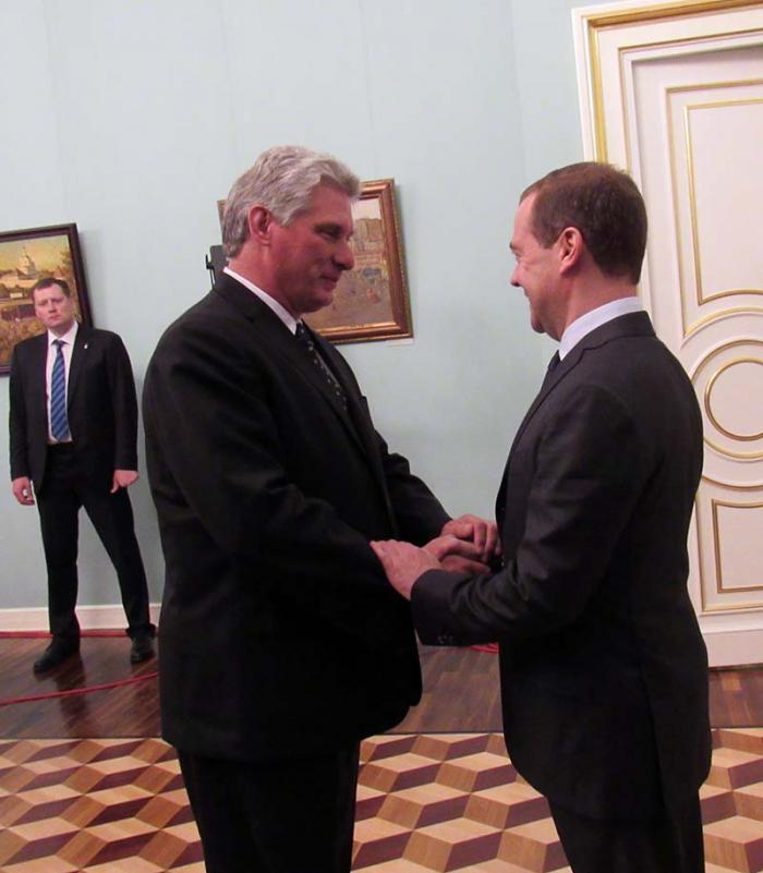 MOSCÚ.—El jefe de Gobierno ruso, Dmitri Medvédev, recibió este jueves en la sede del Ejecutivo al primer vicepresidente de los Consejos de Estado y de Ministros de Cuba, Miguel Díaz-Canel, para analizar el desarrollo de los nexos bilaterales, con las delegaciones de los dos países.