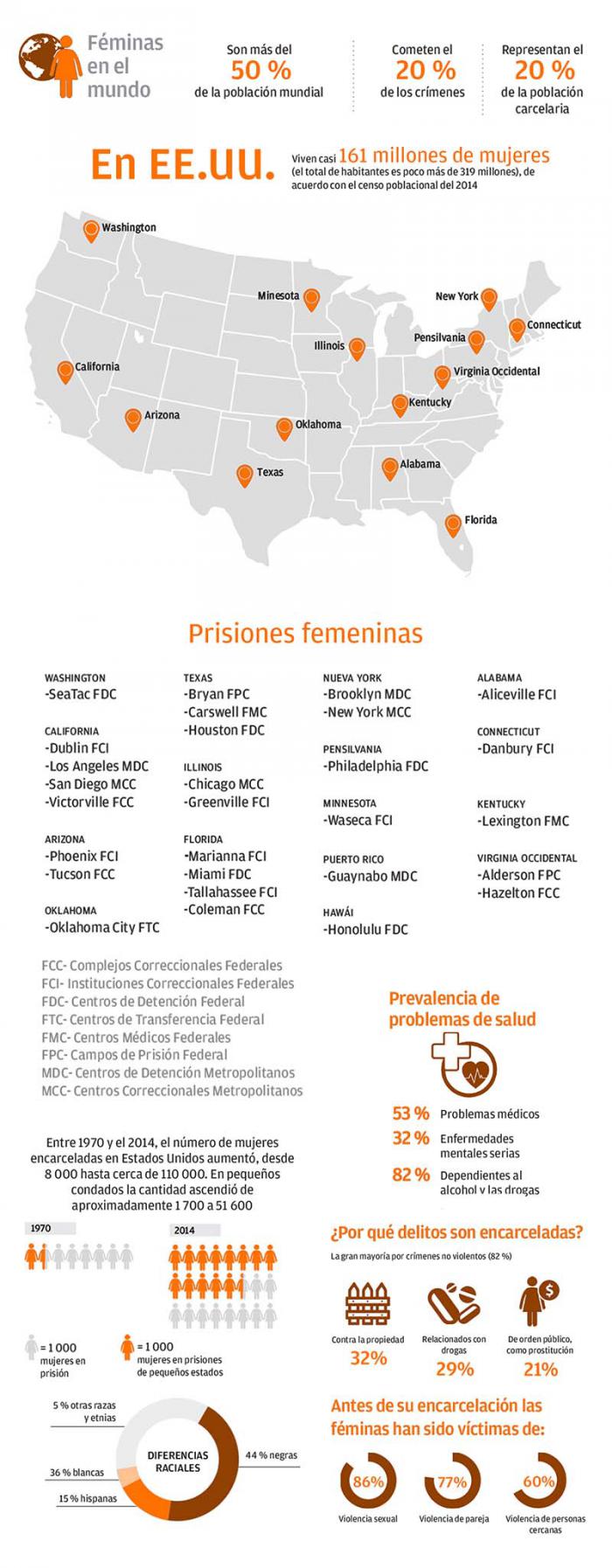 La cifra de mujeres encarceladas en Estados Unidos ha disparado algunas alarmas: el número se ha incrementado en 14 veces desde 1970 —menos de 8 000 hasta cerca de 110 000—, reveló un reciente informe del Vera Institute of Justice y el Safety and Justice Callenge.