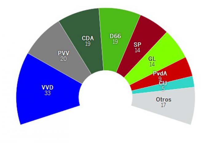 Por su parte, y a pesar de su victoria en los sufragios, el Partido Popular por la Libertad y la Democracia (VVD), agrupación de Rutte, alcanzó solamente 33 de los 76 escaños necesarios para formar gobierno, por ello su formación deberá pactar al menos otros cuatro partidos para alcanzar una mayoría en la cámara baja.