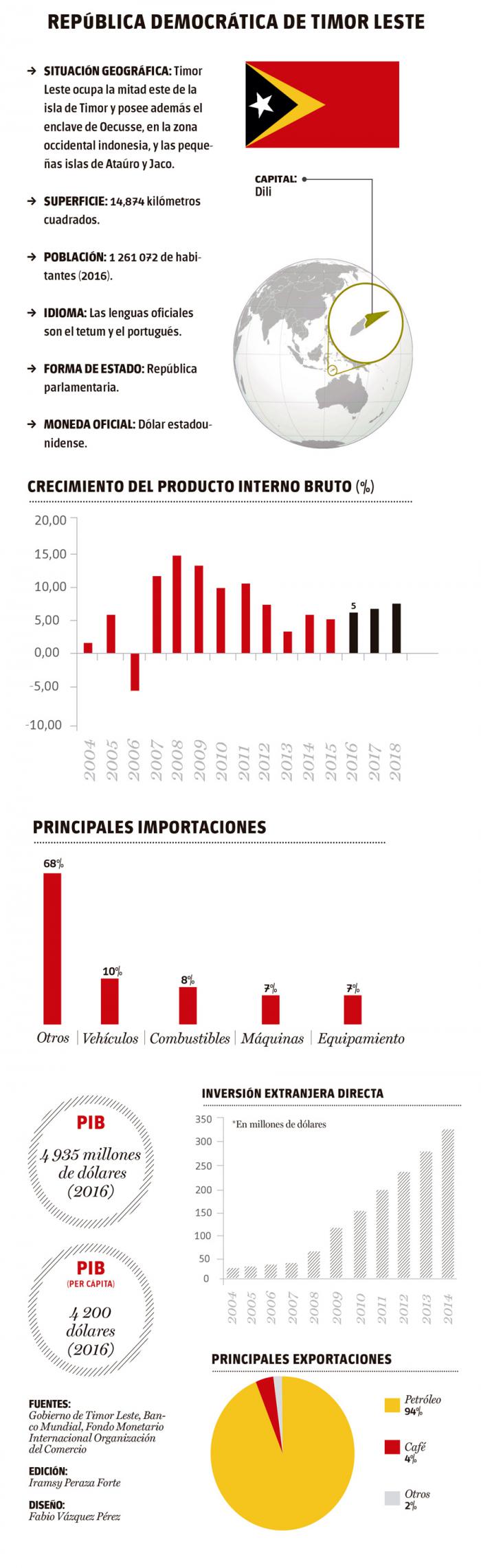 Aunque todavía tiene una elevada tasa de pobreza, su economía pasa por un momento de crecimiento en el PIB, al tiempo que incrementa su atractivo para la inversión extranjera; todos buenos síntomas para un país que vivió repetidos episodios de violencia desde su independencia, en 2002, luego de siglos de colonización portuguesa y más de 25 años de anexión por parte de Indonesia.