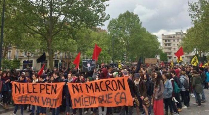 «Hacemos un llamado a la acción contra candidato de extrema derecha Marine Le Pen y el candidato de las altas finanzas, Emmanuel Macron», dijo Giuseppe Aviges, líder del sindicato de estudiantes UNL-SD, en mención al pasado de Macron, inversionista banquero.