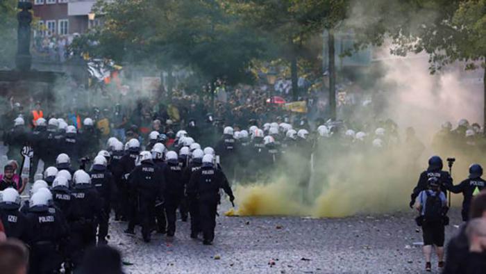 HAMBURG. -La policía alemana reprimió este jueves a manifestantes que salieron a las calles de Hamburgo para llevar a cabo la protesta anticapitalista Bienvenidos al infierno que congregó a 100 000 personas que protestaban contra la celebración de la cumbre del G20, que comienza hoy en esa ciudad.