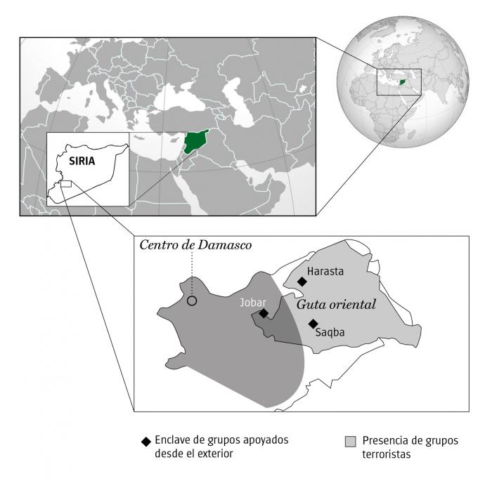 Guta oriental es una región de la campiña de Damasco, cerca de la zona oriental de la capital siria, que contiene una gran cantidad de áreas rurales. Durante los últimos años ha sido uno de los bastiones de los grupos armados que se oponen al Gobierno de Bashar al-Assad y que han recibido apoyo económico y militar desde occidente.