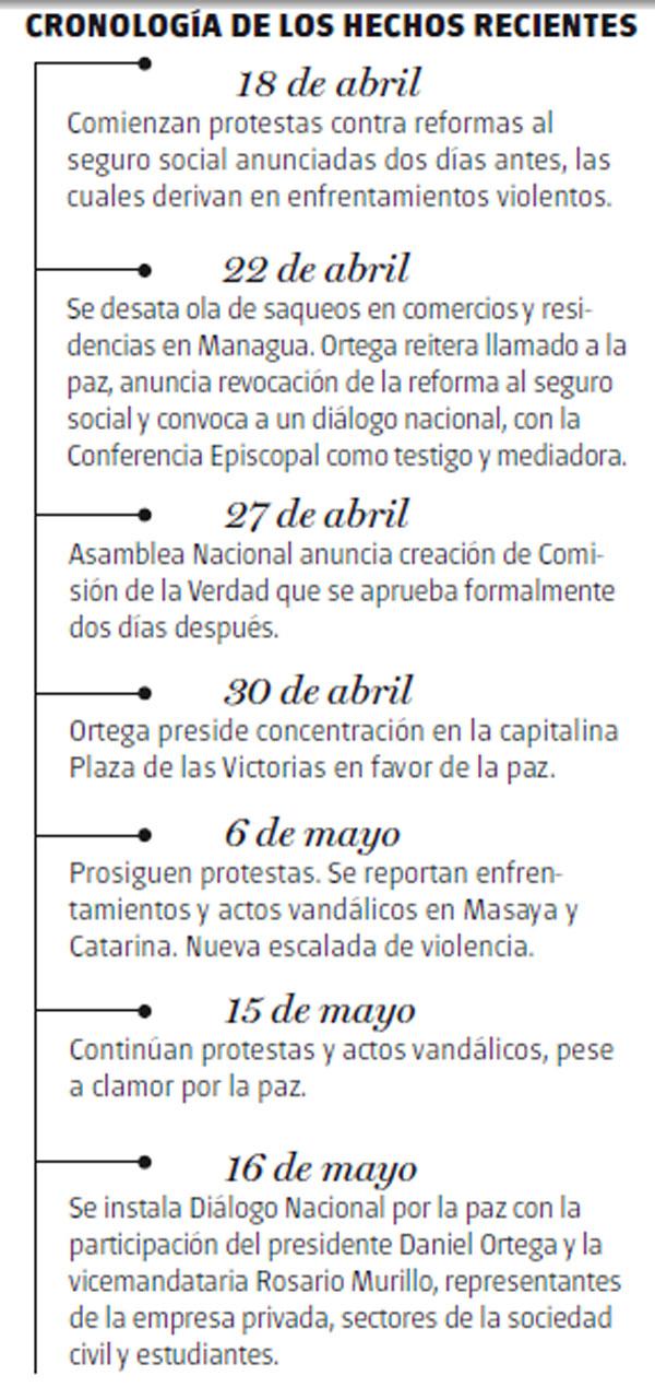 La crisis, sin precedente en las recientes décadas, estalló el pasado 18 de abril contra reformas al seguro social, más tarde derogadas, pero que no detuvieron las protestas, a las cuales se sumaron otras demandas políticas.