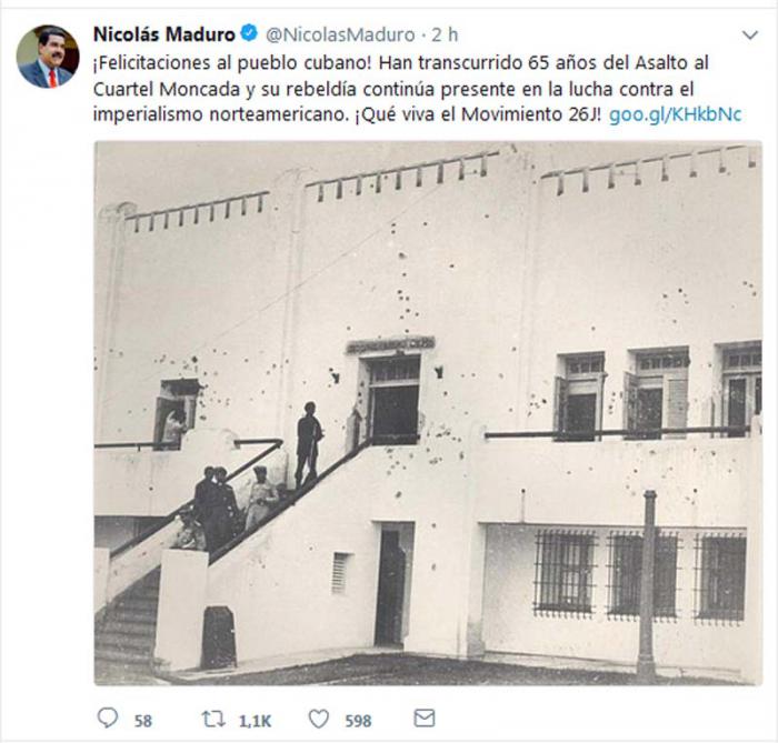 «¡Felicitaciones al pueblo cubano! Han transcurrido 65 años del Asalto al Cuartel Moncada y su rebeldía continúa presente en la lucha contra el imperialismo norteamericano. ¡Qué viva el Movimiento 26J!».