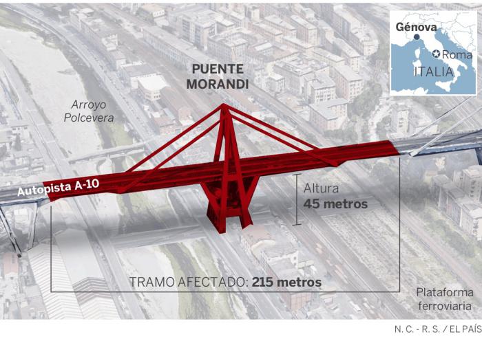 La Policía ha señalado que el derrumbe se produjo después de «una violenta tromba de agua». Las primeras imágenes emitidas por bomberos y medios de comunicación italianos muestran el viaducto en la niebla con varias decenas de metros derrumbados, en un área que parece bastante industrial.