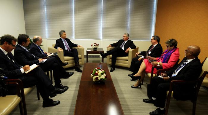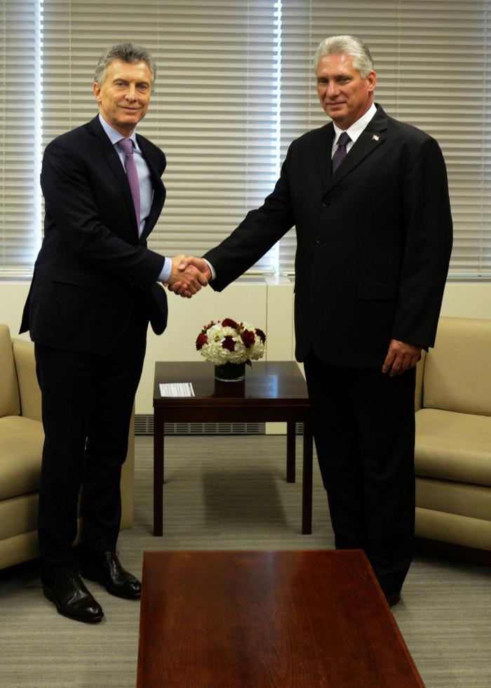 El mandatario cubano, Miguel Díaz - Canel Bermúdez, sostuvo un encuentro con Mauricio Macri, presidente de Argentina, en la sede de las Naciones Unidas, donde ambos participan en el 73 periodo de sesiones de la Asamblea General de las Naciones Unidas. Foto: Estudios Revolución
