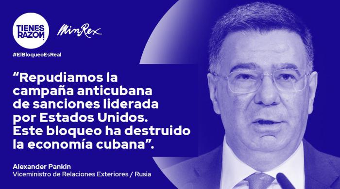 Rusia siempre se ha solidarizado con el pueblo de Cuba, y pide que se levante inmediatamente el bloqueo que va en contra de la carta de Naciones Unidas y constituye una injerencia en los asuntos internos de un Estado, agregó.