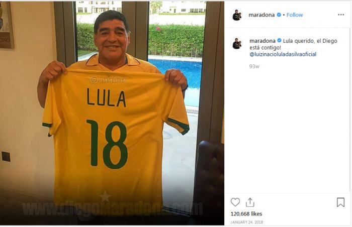 En enero del 2018, el Diez también había utilizado sus cuentas virtuales para acompañar a Lula mientras se llevaba a cabo el juicio que meses más tarde determinaría que debía ser detenido. “Lula querido, el Diego está contigo”, escribió por entonces y posteó una foto con la camiseta de Brasil.