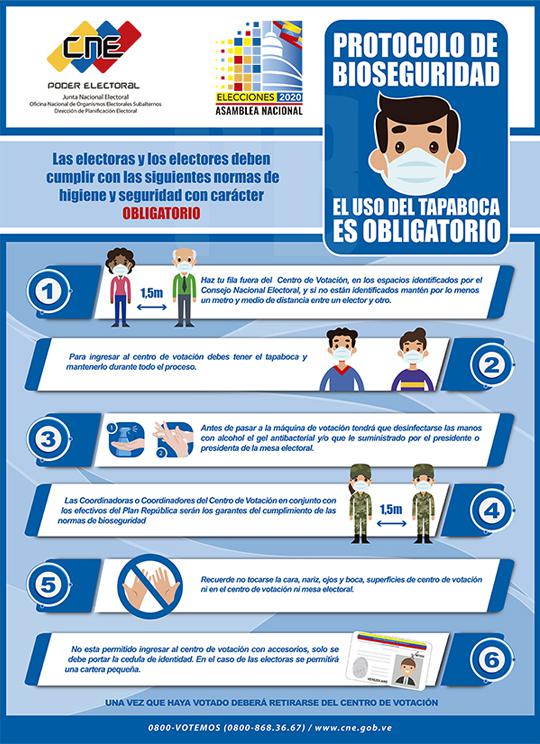 Los electores y electoras, personal operativo, veedores, acompañantes y todos los participantes tendrán garantizado, además, los protocolos de bioseguridad y sanitarios para preservar la salud en medio de la actual pandemia del coronavirus.