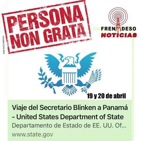 El Frente Nacional por la Defensa de los Derechos Económicos y Sociales (Frenadeso) desde Twitter consideró persona non grata, al jefe de la diplomacia estadounidense, Antony Blinken, quien viajará el próximo martes a Panamá para participar en la Conferencia Ministerial sobre Migración y Protección, los días 19 y 20 de abril, informó Prensa Latina.