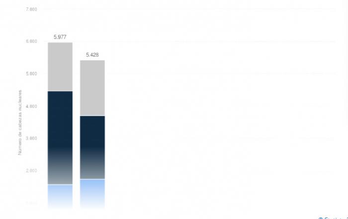 El Instituto Internacional de Estocolmo para la Investigación de la Paz de Estocolmo Sipri (Stockholm International Peace Research Institute), citado por Sputnik, señala que Rusia es la potencia nuclear más grande del mundo con 5 977 ojivas nucleares a principios de 2022, seguida por EE. UU. con 5 428, y China con 350.