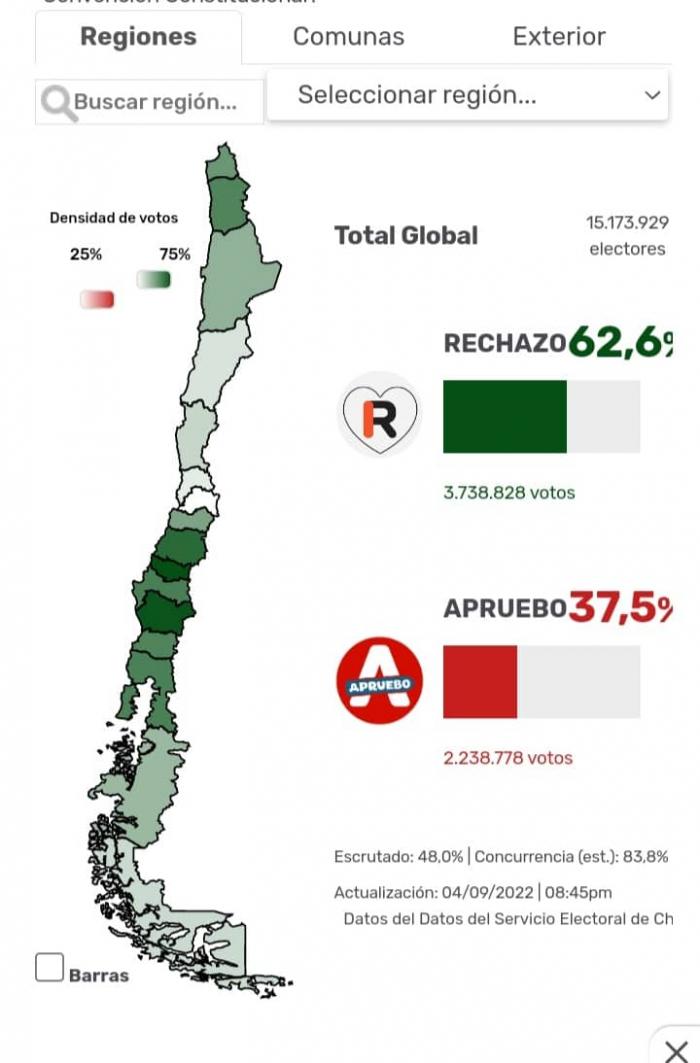 El diario Página 12 informa que el Servel arrojó un nuevo resultado con 8 915 mesas escrutadas de 38.757, es decir, un 23 por ciento: el “rechazo” lleva una amplia distancia del “apruebo”, con un 62,98 por ciento que sobrepasa al 37,02 por ciento.