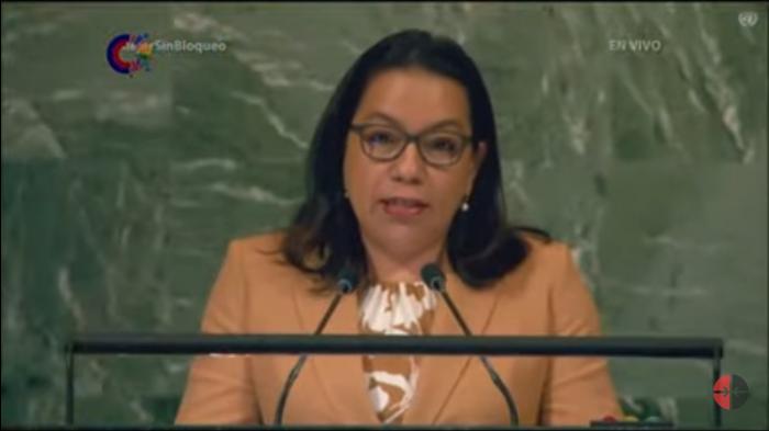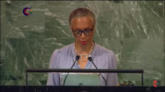 La representante de San Vicente y las Granadinas reiteró su apoyo inequívoco al Gobierno de Cuba al pedir el cese inmediato de la brutal política de cerco económico, comercial y financiero.
