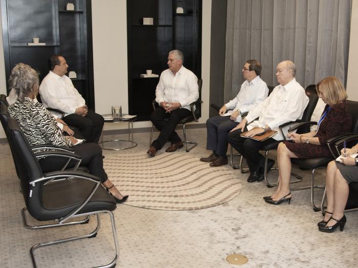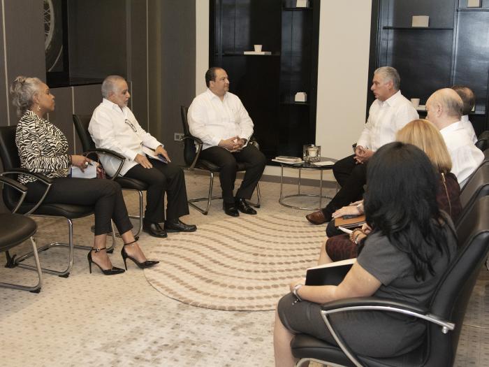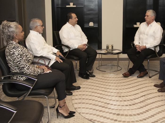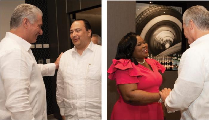 «Esta es una oportunidad también para darle un abrazo a nuestros hermanos caribeños y que ustedes trasladen nuestro saludo a sus primeros ministros», manifestó el Presidente de la República de Cuba al intercambiar luego con los cancilleres de San Vicente y las Granadinas, Keisal Peters, y de Granada, Joseph Andall; así como con el ministro de Finanzas de Santa Lucía, Wayne Girard.