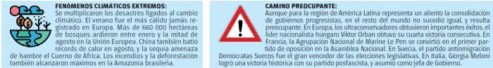 Una serie de acontecimientos, unos más agradables que otros, dejan claro que el ritmo actual al que se mueve la sociedad es insostenible tanto para el medioambiente como para la humanidad. Quedó claro que las grandes potencias pierden terreno, ante economías emergentes que se afianzan en regiones que no admiten ser controladas por Occidente. Pero también que es necesario un nuevo modelo de relación mundial para lidiar con la crisis multisistémica que vivimos. Repasemos algunos de esos principales acontecimientos para entender con mayor claridad lo que puede depararnos el año próximo.