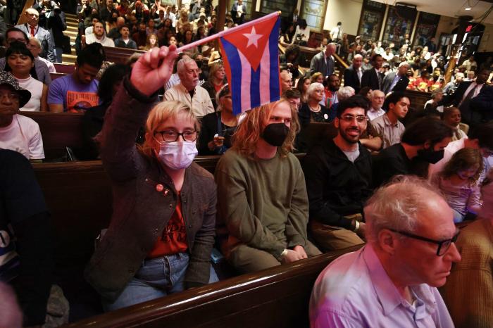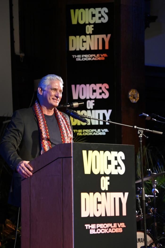 Nos sentimos muy emocionados y conmovidos al participar en este acto de solidaridad de ustedes, las voces dignas de los Estados Unidos, las voces dignas del pueblo norteamericano que dan un enorme apoyo a Cuba y a Venezuela, a nuestras revoluciones hermanas diciendo no a las sanciones y a los bloqueos (Aplausos y exclamaciones).