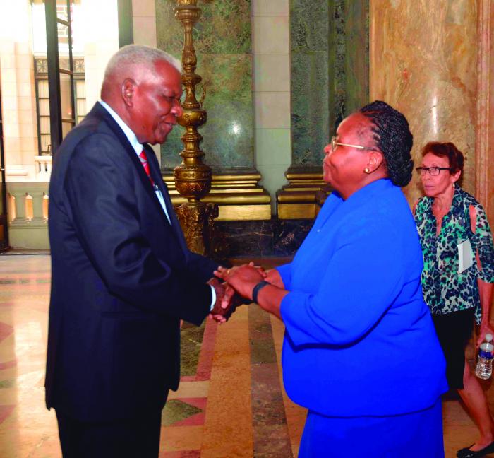 El miembro del Buró Político del Comité Central del Partido Comunista de Cuba y presidente de la Asamblea Nacional del Poder Popular y del Consejo de Estado, Esteban Lazo Hernández, recibió, ayer, en ceremonia oficial, a su homóloga de la Asamblea de la República de Mozambique, Esperança Laurinda Francisco Nhiuane Bias.
