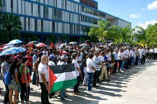 "Nos encontramos aquí, unidos por la convicción de que la justicia y la paz son derechos universales, que no pueden ser pisoteados por la fuerza ni la imposición. Nuestro corazón se Ilena de indignación al presenciar el genocidio que se perpetra contra el pueblo palestino, un pueblo que durante décadas ha sido victima de la brutalidad y la ocupación israelí", expresó Yamilis Almenares González, Presidenta de la Federación Estudiantil Universitaria en la segunda institución de la enseñanza superior más antigua de la Mayor de las Antillas.