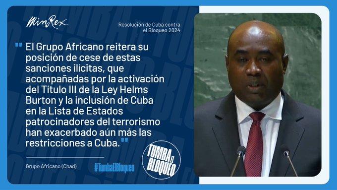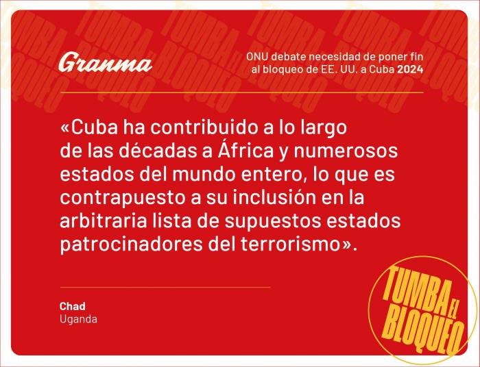 El representante de Chad ante la ONU, Violet Kakyoma, de Uganda, en nombre del grupo africano, al intervenir en la Asamblea General de las Naciones Unidas, expresó que su grupo ha mantenido por años la posición en apoyo a la lucha cubana contra el bloqueo.