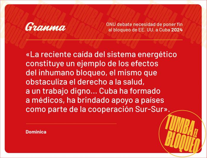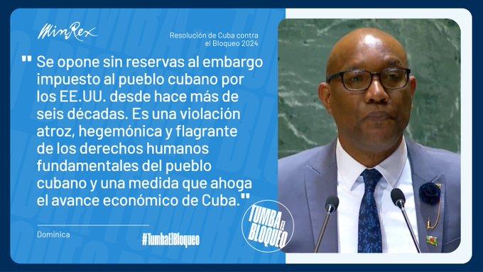En su intervención el representante de Dominica expresó su oposición al bloqueo impuesto por los EE. UU. contra Cuba.
