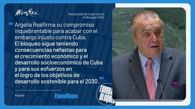«El debate sobre poner fin al bloqueo, muestra una vez más que la comunidad internacional apoya firmemente al gobierno y al pueblo de Cuba» y añadió que por igual destaca el impacto «nefasto para Cuba».