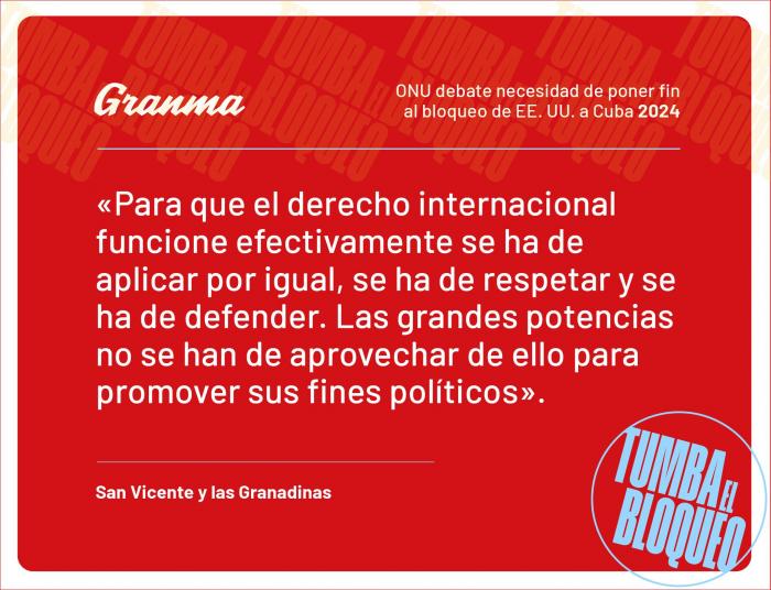 Al intervenir en la representante de San Vicente y las Granadinas trasladó que «los miembros de las Naciones Unidas se reúnen todos los años para votar de manera abrumadora a favor del proyecto resolución de Cuba , lo que significa que la comunidad internacional se ha posicionado contra el bloqueo, posición que está arraigada en el entendimiento y reconocimiento en que estas medidas no solo son anacrónicas, si no que violaciones del derecho internacional y que a su vez amenazan la soberanía de la Isla».