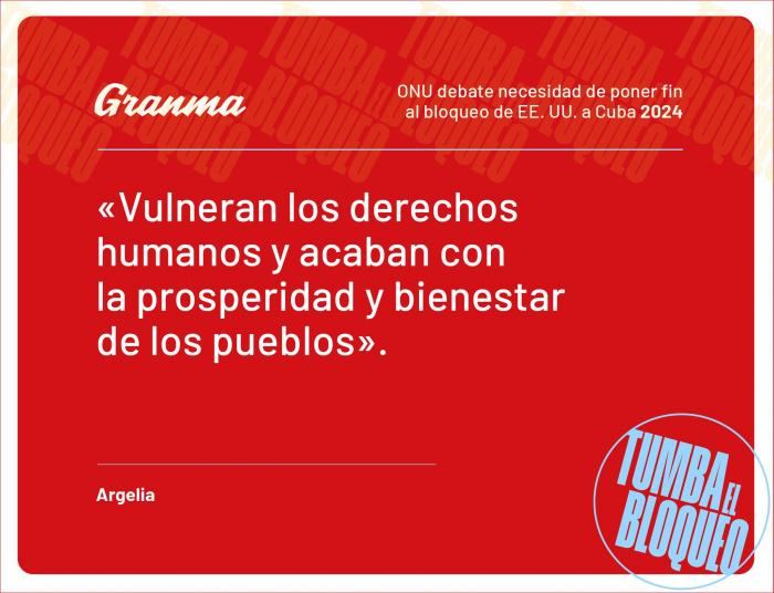 El representante de Argelia manifestó la profunda preocupación de su Gobierno ante el trato inhumano y severo que ha padecido el pueblo cubano por estas medidas que solo «vulneran los derechos humanos y acaban con la prosperidad y bienestar de los pueblos».