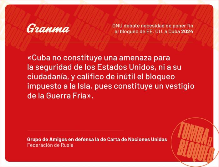 El representante de la Federación de Rusia en nombre del Grupo de Amigos en defensa la de Carta de Naciones Unidas, expresó que «Cuba no constituye una amenaza para la seguridad de los Estados Unidos, ni a su ciudadanía» y calificó de inútil el bloqueo impuesto a la Isla, «pues constituye un vestigio de la Guerra Fría».