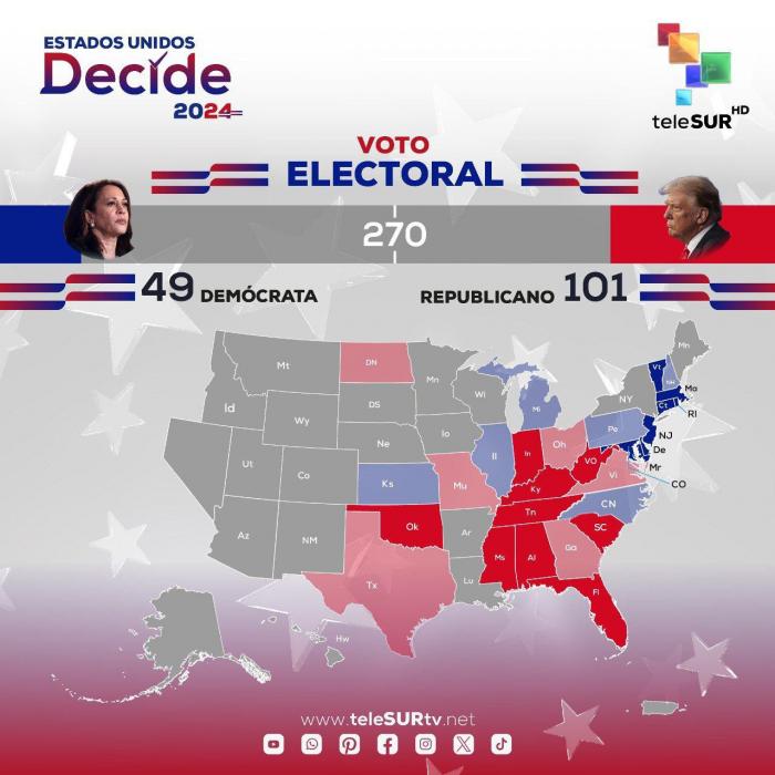 Mientras, la candidata Kamala Harris cuenta con 99 votos electorales tras ganar en Connecticut, Illinois, Kansas, Maryland, Massachusetts, Nuevo Hampshire, Nueva Jersey, Rhode Island, Vermont y los estados indecisos de Michigan y Pensilvania, según información de Telesur.
