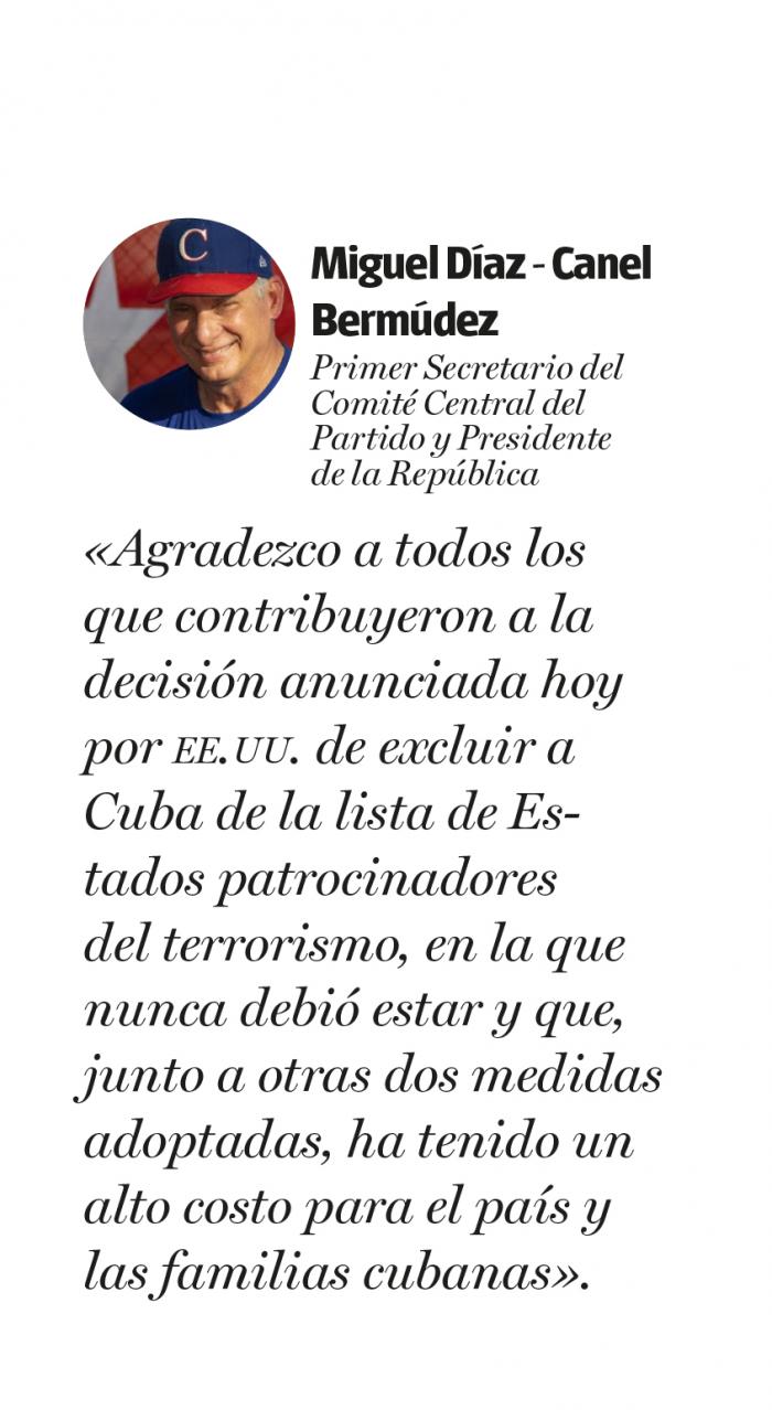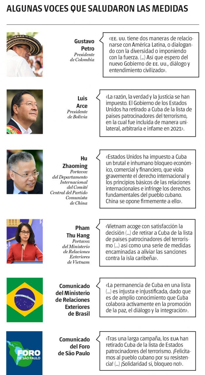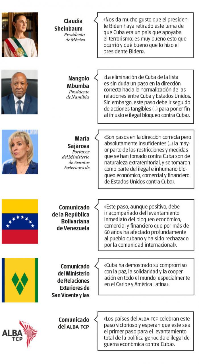 Gobiernos, organizaciones, grupos de solidaridad y asociaciones de cubanos residentes en diversas latitudes expresaron su apoyo a la eliminación de Cuba de la lista de países que supuestamente patrocinan el terrorismo, y llamaron al levantamiento del bloqueo económico, comercial y financiero de Estados Unidos
