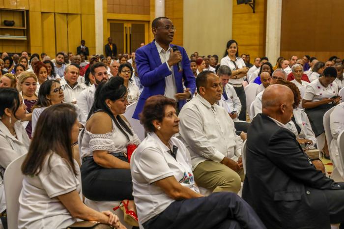 En otro momento de su intervención, se preocupó por las condiciones de vida y trabajo de los internacionalistas, y reiteró que los cubanos que residen fuera de la Mayor de las Antillas «son tan cubanos como nosotros, y siempre estaremos en comunicación y buscando que su solidaridad, desde el frente en que estén, sea también para ayudar a nuestro país».