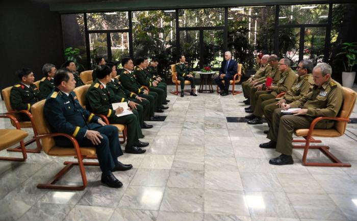 En el encuentro con la amplia delegación vietnamita, el Presidente estuvo acompañado por el miembro del Buró Político y ministro de las Fuerzas Armadas Revolucionarias (FAR), general de Cuerpo de Ejército Álvaro López Miera; por el viceministro primero y jefe del Estado Mayor General de las FAR, general de Cuerpo de Ejército Roberto Legrá Sotolongo, así como por otros altos oficiales.