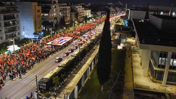 Al concluir el acto, la multitud, encabezada por los principales dirigentes del KKE, de la juventud del KNE y de otras organizaciones, comenzó una marcha solidaria por una de las principales avenidas de la capital griega, rumbo a la sede diplomática de los Estados Unidos.
